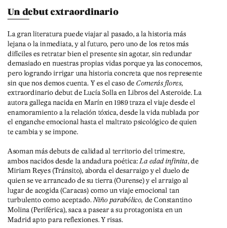 «Lo concreto de la edad y la abstracción de lo infinito convergen en un punto: el cuerpo de una mujer en la Historia. Reyes escribe de dinero, política, petróleo, las dos orillas del Atlántico, de toda la violencia que se sufre cuando alguien se empeña en pertenecer y no pertenece a un país, una nación, una familia, un paisaje, un acento, el propio nombre. Cuando no hay origen ni destino, solo extrañeza. Escribe sobre la desubicación reversible. Miriam Reyes en su relato autobiográfico dibuja hermosamente una identidad compuesta de fragmentos que luchan entre sí: el cuerpo solo tiene sentido en la distancia insalvable que media entre cada uno de sus pedazos».